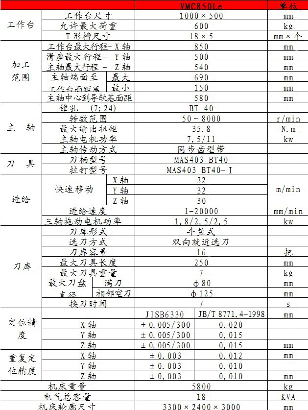 VMC850Le型立式加工中心采用立式框架布局,立柱固定在床身上,主轴箱沿立柱上下移动(Z向)、滑座沿床身纵向移动(Y向)、工作台沿滑座横向移动(X向)的结构。